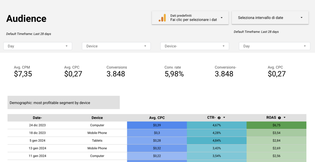 This dashboard provides you with a straightforward view of e-commerce most important kpis. It consists of 4 pages that allow you to edit and integrate with your data to export specific segments for your Marketing ADV campaigns.